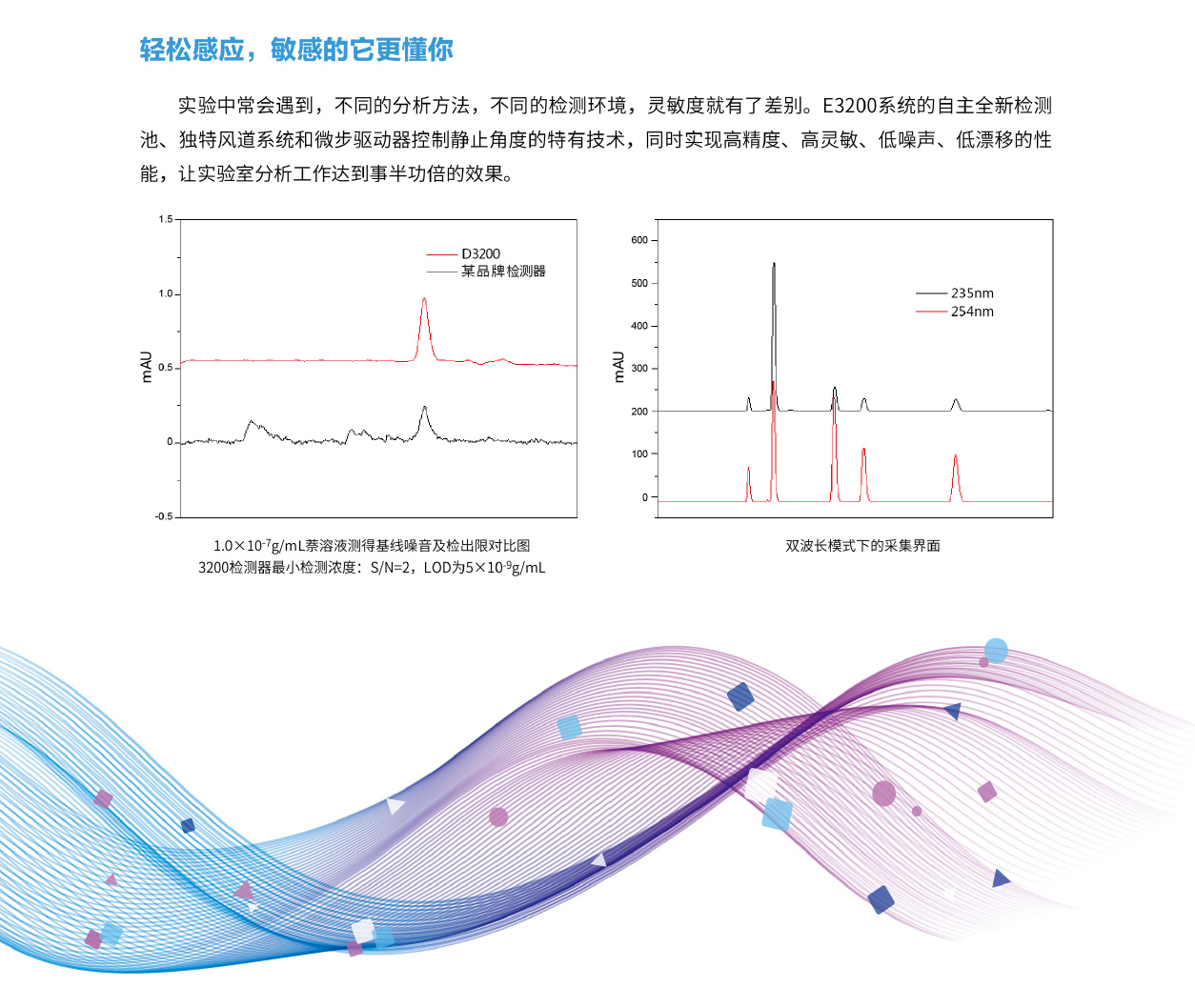 D3200系列紫外-可见检测器作为高效精东视频APP下载入口的检测单元,具有双波长功能,并且配备了氘灯和钨灯两种光源。可便捷地与各种液相色谱输液泵、自动进样器、色谱柱恒温箱等其它单元配合使用,也可以单独作为检测工具使用。