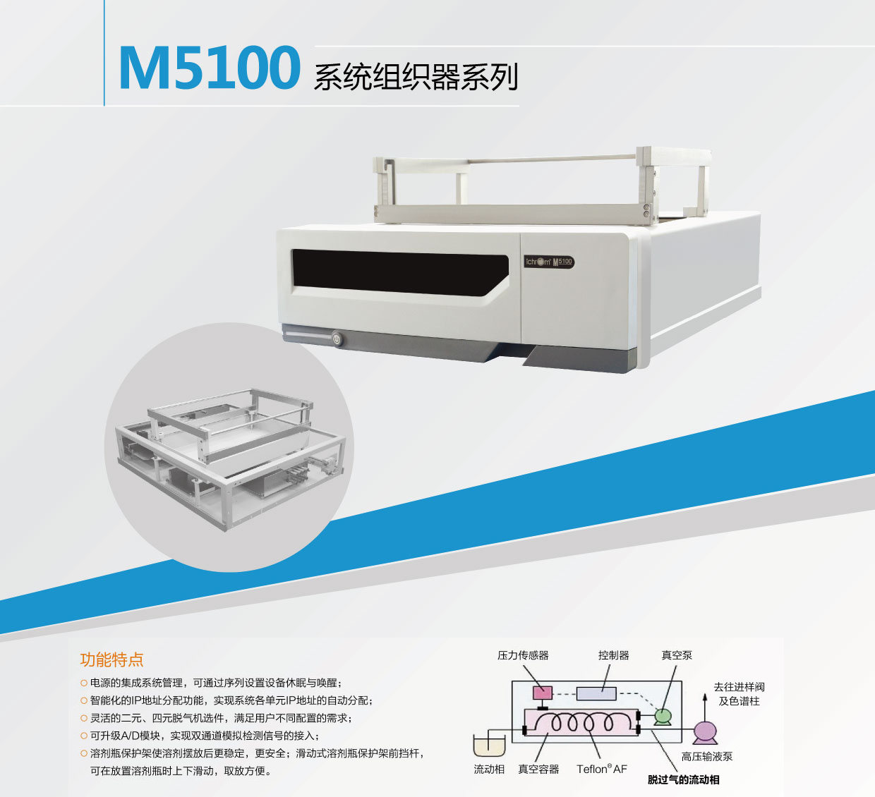 M5100系统组织器是iChrom 5100产品中多功能集于一体的单元部件,它集成了在线脱气机、溶剂瓶托盘及高性能液相色谱专用溶剂瓶。它是5100产品网络数据通信、电源分配的枢纽,确保了实验数据的准确性、可靠性;优化的管路连接,方便对溶剂的维护管理。M5100组织器包括两个型号:M5101和M5102系统组织器,M5101是不带脱气功能的系统组织器,M5102为带脱气功能的系统组织器。